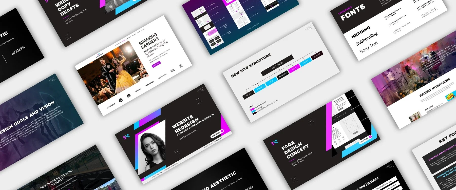 Rather than approaching the project as individual page redesigns, we designed a cohesive ecosystem to support Lily B.’s message and personal brand across film, media, and speaking.