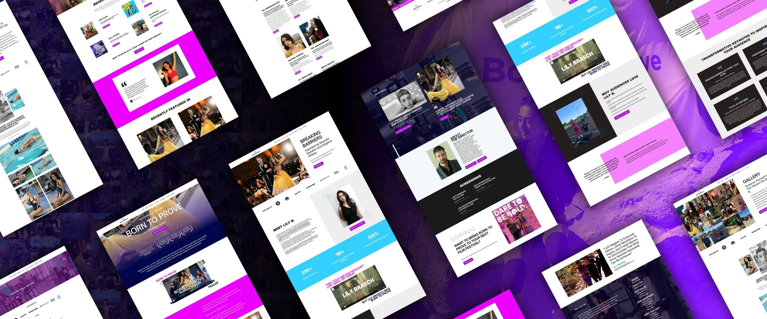 The project required a strategic redesign that could support multiple touchpoints: A dedicated film page for Born To Prove, a refined media and gallery experience to showcase press and visual storytelling, and a purpose-built speaking page to clearly position Lily B. for bookings, collaborations, and public appearances. The website needed to feel powerful, emotionally resonant, and credible, while supporting both media visibility and long-term personal brand expansion.